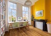 Op deze verdieping is de eerste slaapkamer/ werkkamer, die als fantastische werkkamer wordt gebruikt. Ook hier wordt de sfeer bepaald door het hoge plafond, een marmeren schouw en twee hoge ramen met de originele ruitverdeling.