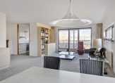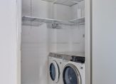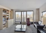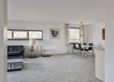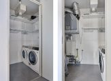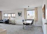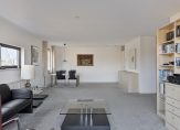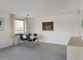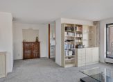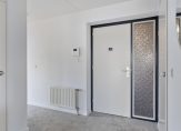 Vanaf de lift en trap is het maar een paar stappen naar de voordeur van dit lichte appartement. In de hal ligt, net als in een groot deel van het appartement, tapijt op de vloer. Links in de hal is de toiletruimte met fonteintje en naast de voordeur hangt de video-intercom, waar je kunt horen en zien wie bij huisnummer 55 aanbelt.