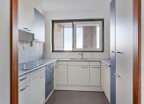 Een brede doorgang verbindt de woon-/eetkamer met de keuken, waar een U-opstelling staat. Deze keuken biedt veel bergruimte en de keramische kookplaat, afzuigkap, vaatwasser, koelkast en vriezer zijn ingebouwd. Op een paar meter van de keuken is een inpandige berging, die onder andere ruimte biedt aan de wasmachine en droger.