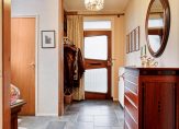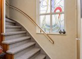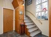 Naast de mooie erker is de entree van deze verrassend ruime, karakteristieke woning. Als eerste zie je de hal met prachtig glas in lood in de zijgevel, heerlijk licht en met een ruime opzet. Aan de rechterzijde zijn de garderobe, trapopgang en de toiletruimte met fonteintje.