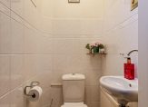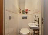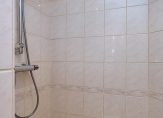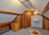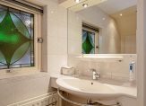 De badkamer is ingedeeld met een ruime douche en een wastafel. Erg mooi is het grote glas in loodraam, waar gebruik is gemaakt van figuurglas. De separate toiletruimte met fonteintje is uitgevoerd in dezelfde stijl als de badkamer.