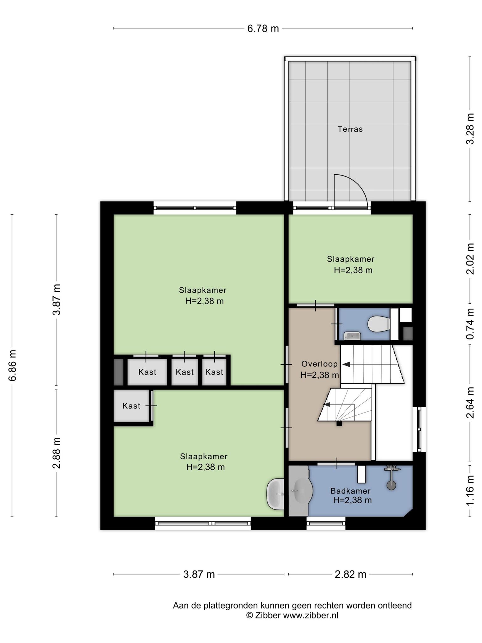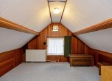 Er is een vaste trap naar de tweede verdieping, waar nog twee slaapkamers zijn. Beide kamers zijn te bereiken vanaf de overloop en voorzien van bergruimte in de schuinten van het dak. In de slaapkamer aan de achterzijde hangt een wastafel.