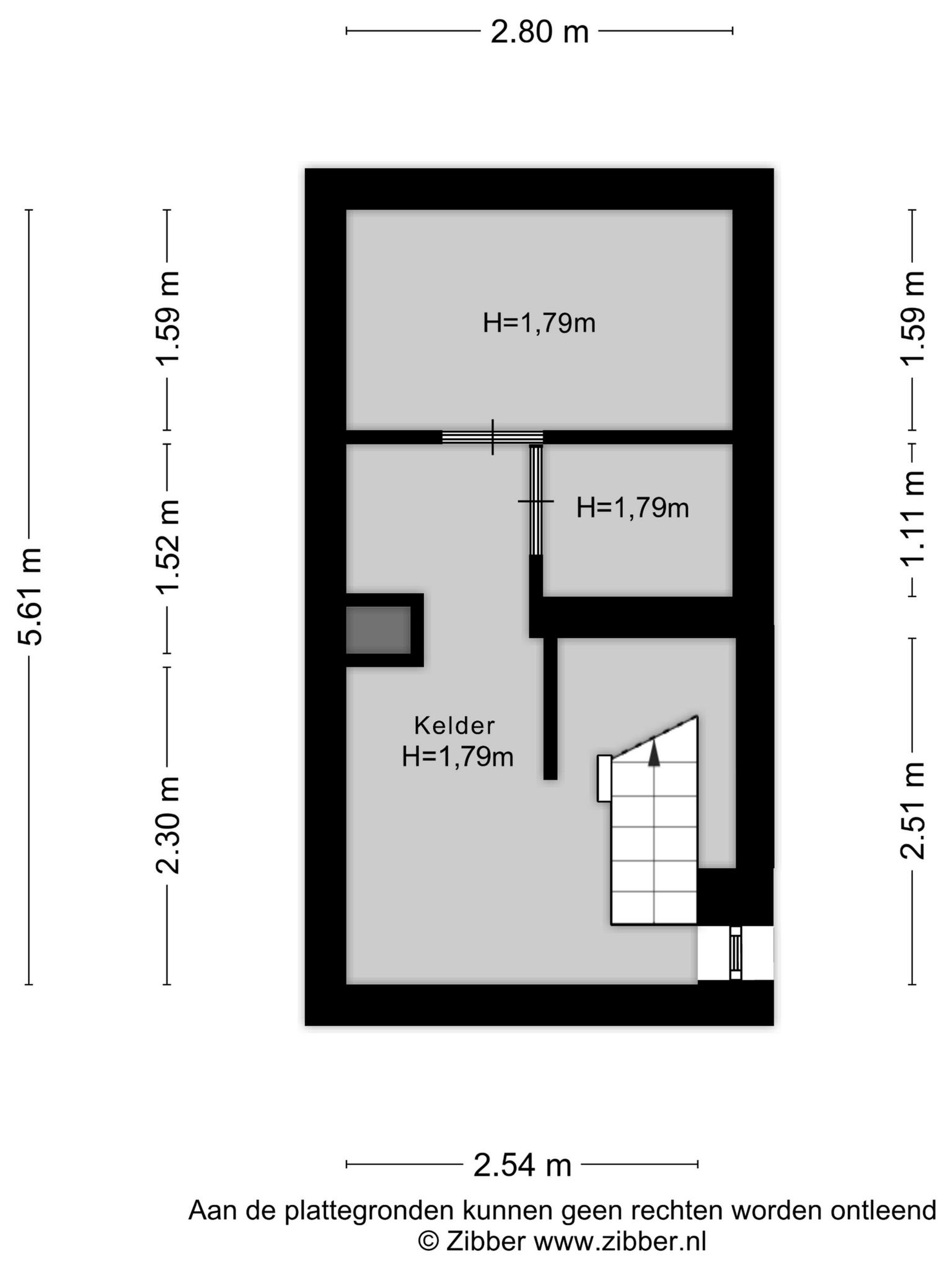 Achter een van de deuren in de hal is een trap die leidt naar de kelder, die bestaat uit drie ruimtes met een hoogte van ca. 1.79 meter.