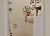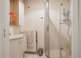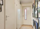 Open de voordeur naar de lange, L-vormige hal van dit goed ingedeelde appartement. Aan de rechterzijde zijn de meterkast, de toiletruimte met fonteintje en de badkamer. De badkamer is ingedeeld met een kwartronde douche, wastafelmeubel en tegelwerk in lichte kleuren.
