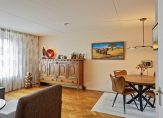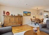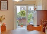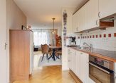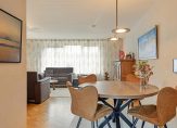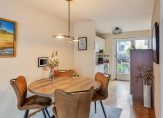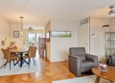 De woon-/eetkamer bevindt zich aan de westkant van het appartement, met grote ramen die voor veel lichtinval zorgen. Aan de achterzijde is de halfopen keuken met een deur naar het terras. De visgraat parketvloer met bies geeft de woonkamer en keuken een fraaie uitstraling.