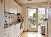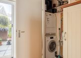 In de keuken staat een nette wandopstelling met een aparte, hoge kast voor de koelkast. Verder zijn de keramische kookplaat, afzuigkap, vaatwasser en combi-oven/magnetron ingebouwd. Heel handig; in een berging/cv-ruimte is de opstelling van de wasmachine en droger.