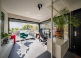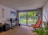 Via de buitentrap aan de voorzijde bereikt u de tweede entree van deze stijlvolle, speels ingedeelde villa. U stapt binnen in een lichte kantoor-/werkkamer met een donkere tegelvloer en mooi uitzicht aan twee zijden. Perfect voor een ondernemer die vanuit huis werkt, die op zoek is naar rust en ruimte.
