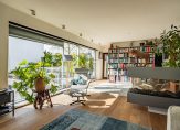 Aansluitend is de zeer royale woonkamer met een trap naar de begane grond en een trap naar de tweede verdieping. Omdat de eettafel in de woonkeuken staat, kan de woonkamer geheel als zitkamer worden ingedeeld. Blikvanger is de gashaard, die vanaf drie zijden te bewonderen is en de leefruimte op een subtiele wijze in twee zitgedeeltes verdeelt. Een grote schuifpui geeft toegang tot het dakterras, dat bij goed weer een verlengstuk van de woonkamer is.