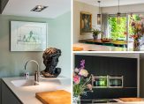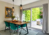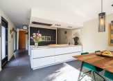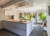 In de aansluitende keuken is genoeg plek voor een grote eettafel. Een schuifpui geeft toegang tot het terras aan de achterzijde en er is een deur naar de tuin. Aan de buitenmuur hangt een airco-unit (wandmodel), die kan koelen en verwarmen. De moderne keukenopstelling (2017) met kook-/spoeleiland is voorzien van alle benodigde inbouwapparatuur: een inductie kookplaat, afzuiging in plafond, een Quooker, vaatwasser, oven, combimagnetron, koelkast en een vriezer.