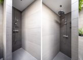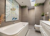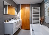 De badkamer, met een lichtkoepel in het dak, heeft alles wat je nodig hebt. Achter de muurtjes is een dubbele douche en verder zijn er een ligbad, tweede toilet en een badmeubel met twee wastafels.