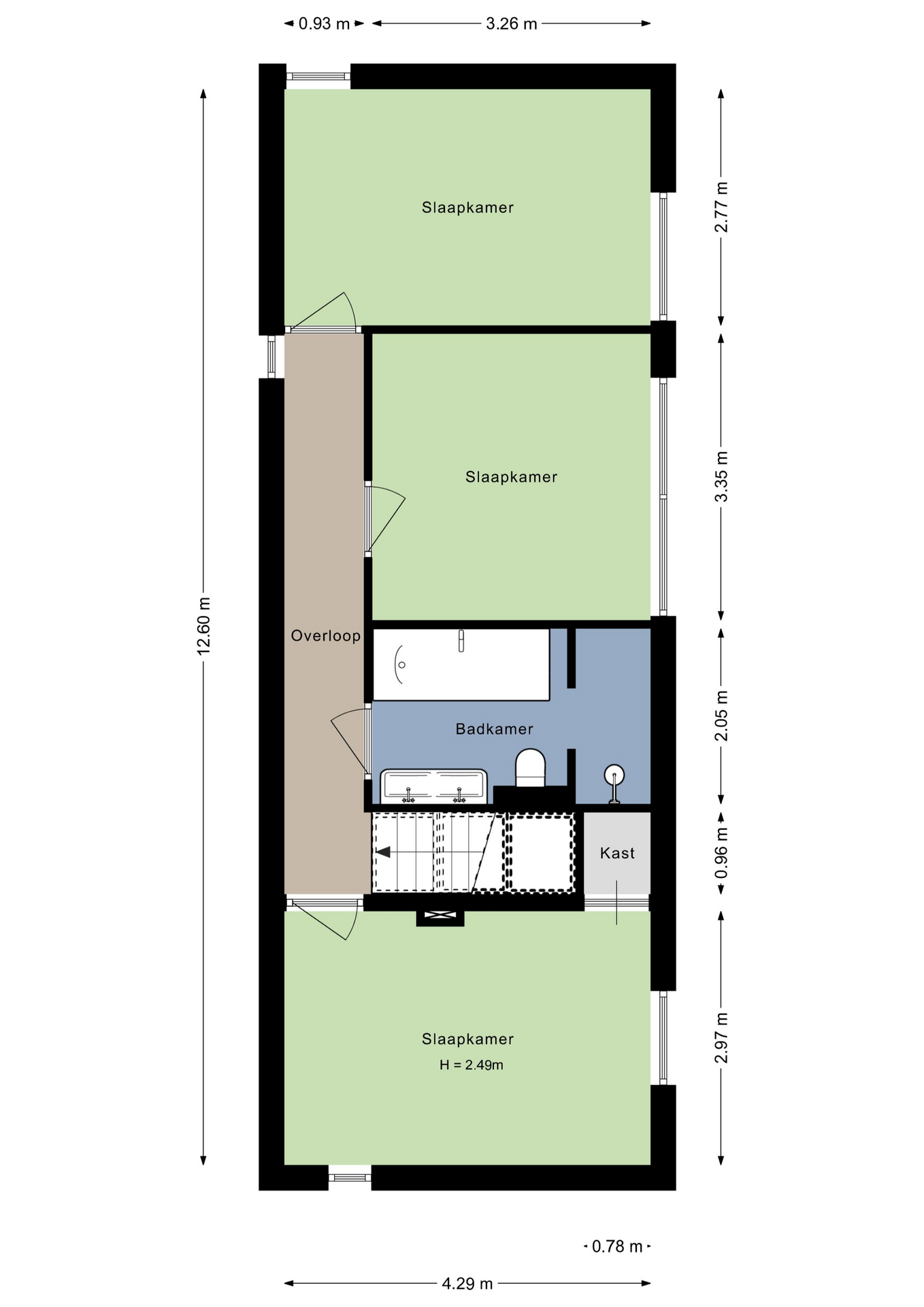 Op de tweede, tevens bovenste verdieping zijn een lange overloop, drie ruime slaapkamers en de badkamer. De sfeervolle master bedroom bevindt zich aan de achterzijde en de slaapkamer aan de voorzijde is in gebruik als logeerkamer. Naast de badkamer is de derde slaapkamer, die nu als kleed- en sportruimte in gebruik is.