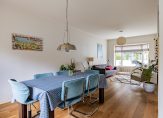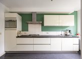 In de woonkamer, met erker, is een mooie verdeling tussen het zit- en het eetgedeelte. De houten vloer en de maatwerk kastenwand zijn de sfeermakers in deze gezellige leefruimte. Vanaf het eetgedeelte loop je zo de keuken in, die ook vanuit de hal te bereiken is. De keukenopstelling, geplaatst in 2010, is uitgevoerd in een neutrale kleur en heeft alle benodigde inbouwapparatuur: een gaskookplaat, afzuigkap, combi-oven, koelkast en een vaatwasser (2024).