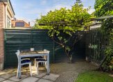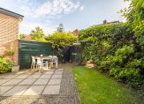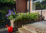 Het voortuintje, met bestrating en lage beplanting, is op het westen gericht. Dat betekent dat de achtertuin, te bereiken vanuit de keuken, op het oosten is. Naast het terras zie je een pergola, waar een druivenstruik rijkelijk groeit. Verder zie je mooie beplanting, een stukje gras en een poort naar de steeg. Ook het balkon, te bereiken vanuit de master bedroom, is op het oosten gericht.