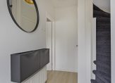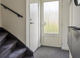 Niet alleen de kozijnen, maar ook de voor- en achterdeur zijn van kunststof. Via de voordeur loop je de hal in, die dankzij het raam heel licht is. Aan de rechterzijde zijn de in 2023 vernieuwde toiletruimte, de trapopgang en een handige bergkast. Op de trap ligt hoogpolig, donker tapijt en de PVC-vloer ligt in de hal, woonkamer en keuken.