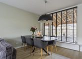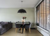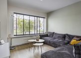 De woonkamer heeft grote ramen aan de oost- en westkant, met uitzicht naar de tuin en het plantsoen aan de overzijde van de straat. Het zitgedeelte is aan de voorzijde en het eetgedeelte aan de achterzijde, naast de halfopen keuken. Stucwerk op de muren en het plafond geeft de woonkamer een strakke uitstraling, die je met schilderen al snel een andere sfeer kan geven.