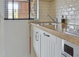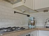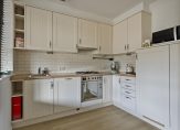 In de keuken staat een lichte hoekopstelling (2000) met een granieten aanrechtblad en crèmekleurige tegels op de achterwand. Deze keuken biedt veel bergruimte en de gaskookplaat, afzuigkap, vaatwasser (2020), oven en koelkast zijn ingebouwd.