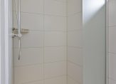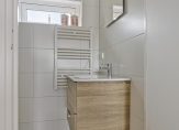 De badkamer, compact van formaat, is net als de toiletruimte in 2023 vernieuwd. Grote, witte tegels en het raam maken de ruimte optisch groter. Aan de linkerzijde is de inloopdouche en naast de elektrische radiator hangt een wastafelmeubel met spiegel.