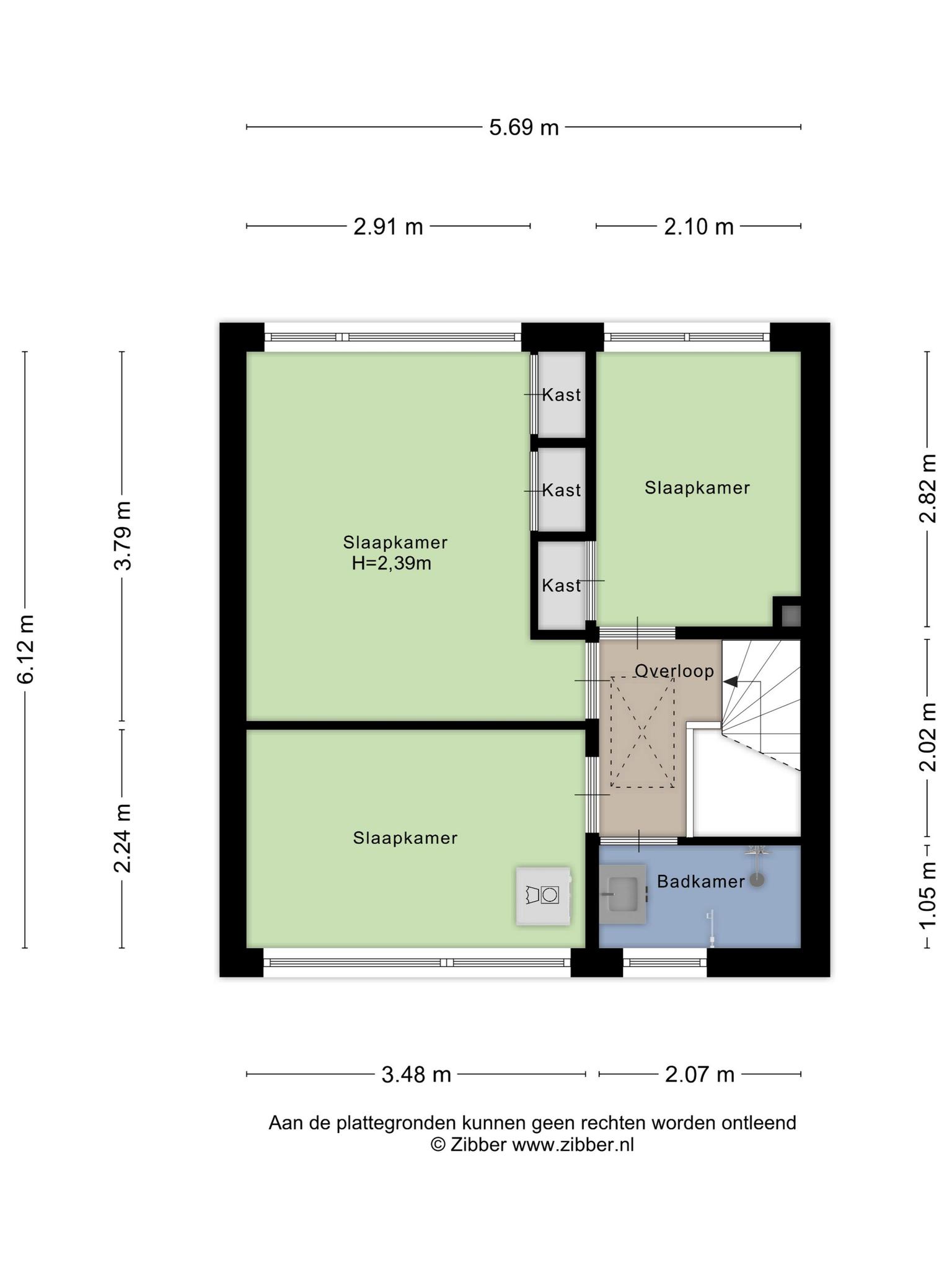 Vanaf de overloop zijn drie slaapkamers en de badkamer te bereiken. Op de overloop, bij het trapgat, hangt een elektrische radiator en in de ouderslaapkamer een airco-unit, die kan koelen en verwarmen.
