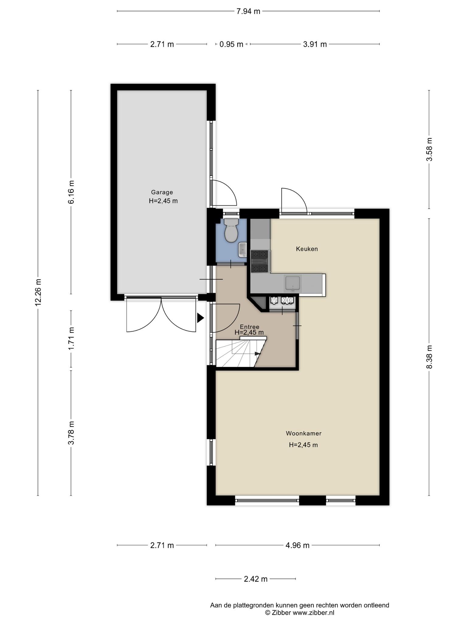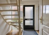 Aan het einde van de oprit is de entree van deze ruime, lichte woning. In de hal zie je de open trap naar de eerste verdieping, de meterkast en de toiletruimte met fonteintje. Ook kun je inpandig de meer dan 6 meter lange garage bereiken, voorzien van elektra en een betonvloer.