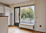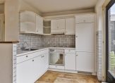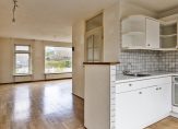 De L-vormige woonkamer met open keuken heeft een totale oppervlakte van circa 33 m2. Het ruime zitgedeelte is aan de voorzijde en aan de achterzijde, bij de keuken, is plek voor een eettafel. In de keuken staat een eenvoudige hoekopstelling (gedateerd) met een gaskookplaat, afzuigkap, oven, koelkast en een vriezer.