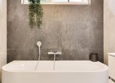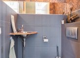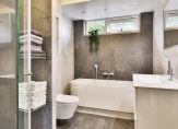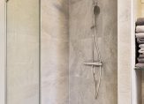 In 2017 is de badkamer geheel vernieuwd. Grote tegels in licht- en donkergrijs geven deze ruimte een luxe uitstraling. Je hebt de beschikking over een bad, een inloopdouche, wandcloset en een wastafelmeubel. Mooie elementen zijn de glazen planken voor handdoeken, de inbouwverlichting en de spiegel boven de wastafel.