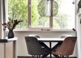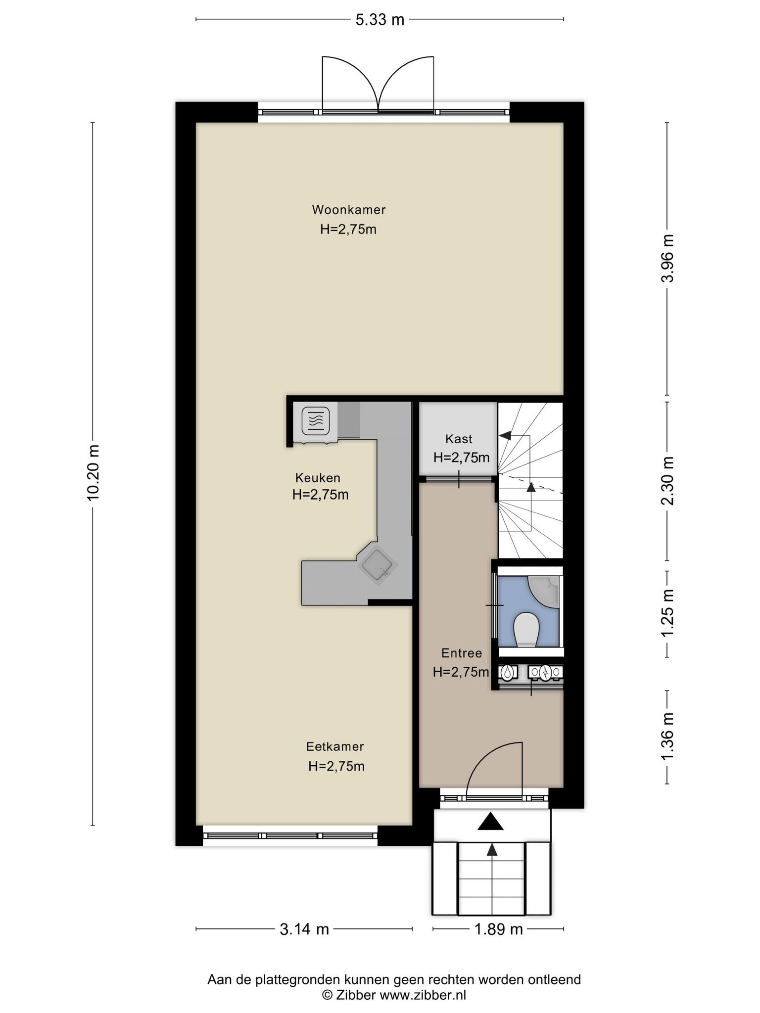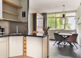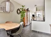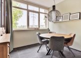 De eetkamer, keuken en woonkamer vormen samen een leefruimte van ca. 40 m². De eetkamer is aan de voorzijde, met mooi uitzicht naar de straat, en het meer dan 5.30 meter brede zitgedeelte is aan de achterzijde. Openslaande deuren geven toegang tot de tuin en onder de grote, grijze tegels ligt vloerverwarming.