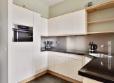 In de keuken staat een lichte U-opstelling met een stijlvol zwart composiet blad en een rvs achterwand. De keramische kookplaat, afzuigkap, vaatwasser, koelkast en combi-oven zijn ingebouwd.