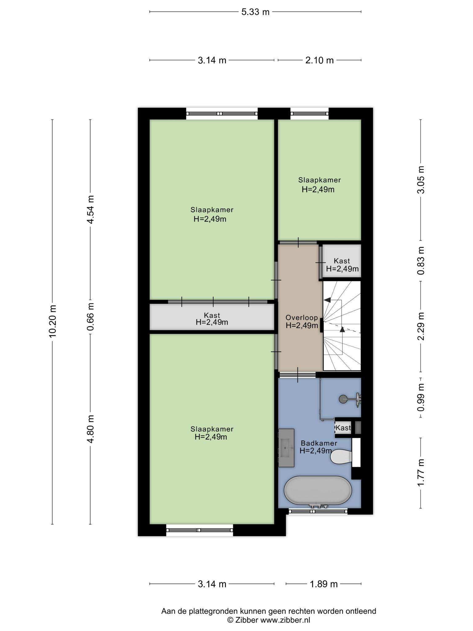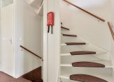 Een verdieping hoger zijn de overloop met bergkast, drie slaapkamers en de badkamer. Aan de achterzijde zijn twee slaapkamers, beiden voorzien van rolluiken en één met een meer dan 3 meter lange kastenwand. De derde slaapkamer, groot genoeg om in te richten als tweepersoonskamer, bevindt zich aan de voorzijde.