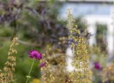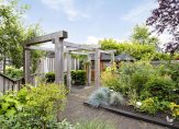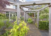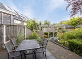 Vanuit de woonkamer is de diepe achtertuin op het noorden te bereiken. Diagonale lijnen en verschillende materialen, zoals hout en steen, zorgen voor een tuin met sfeer. Er zijn meerdere zitplekken gemaakt, in de zon en schaduw. Achter in de tuin staat een berging voor het tuingereedschap.