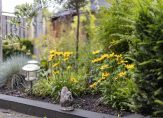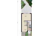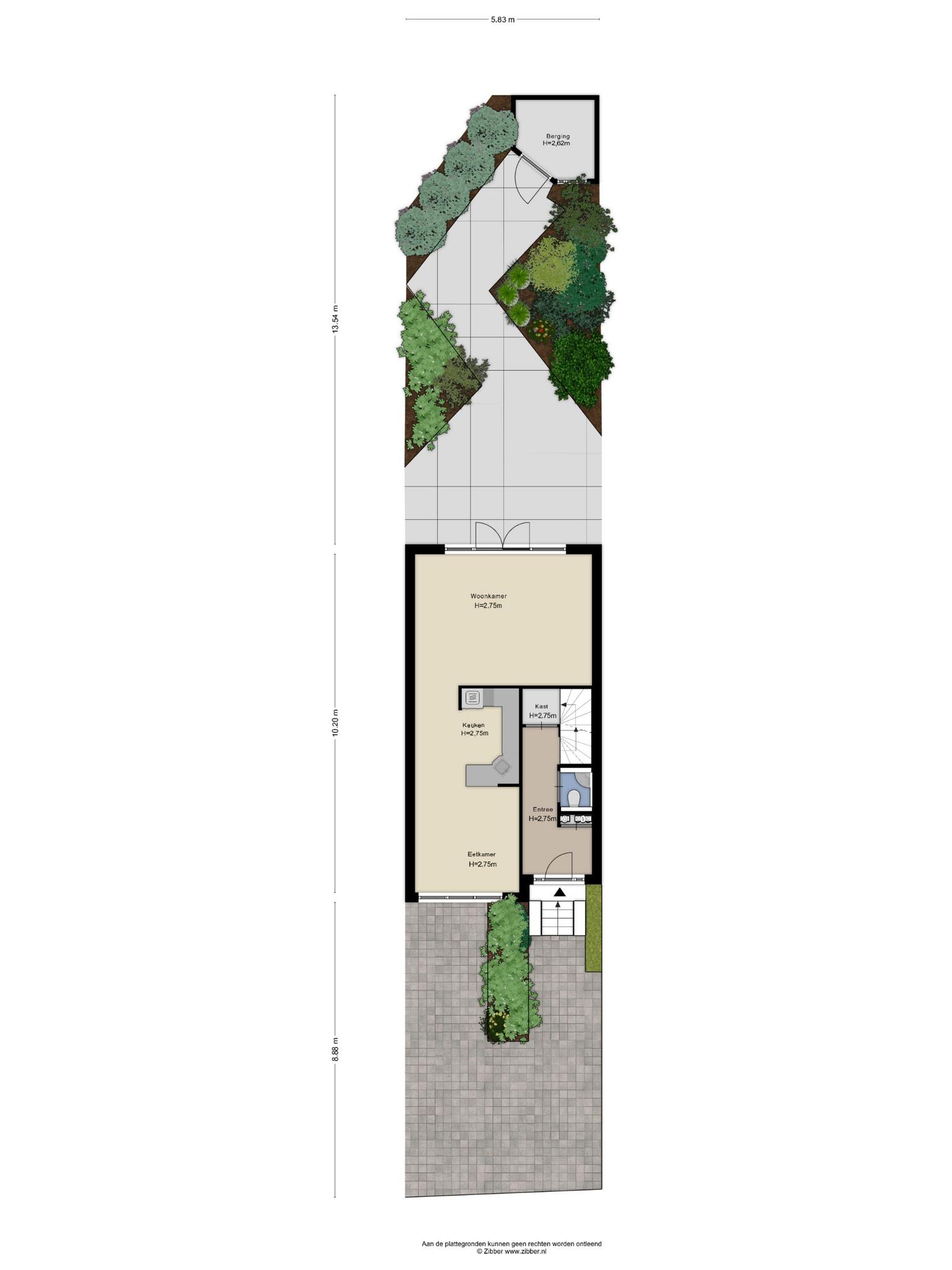 Aan de voorzijde zie je de oprit, buitentrap, een mooie boom en verschillende beplanting. Achter één van de struiken is een loopdeur naar de garage.