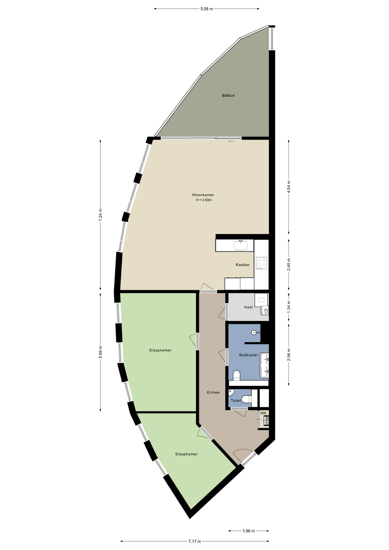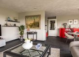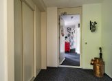 Vlak naast de lift is de voordeur van dit lichte, speels ingedeelde appartement. Vanuit de lange hal zijn alles kamers en overige ruimtes te bereiken, waaronder de toiletruimte met fonteintje. De donkere tegelvloer ligt niet alleen in de hal, maar ook in de woonkamer en keuken.