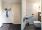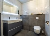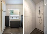 Aan de andere zijde van de hal is de badkamer, vlak naast de toiletruimte. In deze fraaie ruimte valt je ook op het strakke tegelwerk, de inloopdouche, wandcloset, designradiator en het tweepersoons wastafelmeubel.