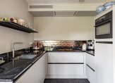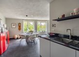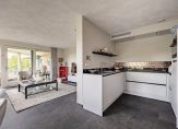 De woonkamer is een gezellige leefruimte, met veel lichtinval en een grote schuifpui naar het balkon. Niet alleen het zitgedeelte, maar ook het eetgedeelte heeft een ruime opzet. In de halfopen keuken staat een stijlvolle U-opstelling met een inductie kookplaat, plafondafzuiging, een vaatwasser, Quooker, koelkast en een combi-oven. De inpandige berging biedt onder andere ruimte aan een vriezer en de wasmachine.