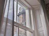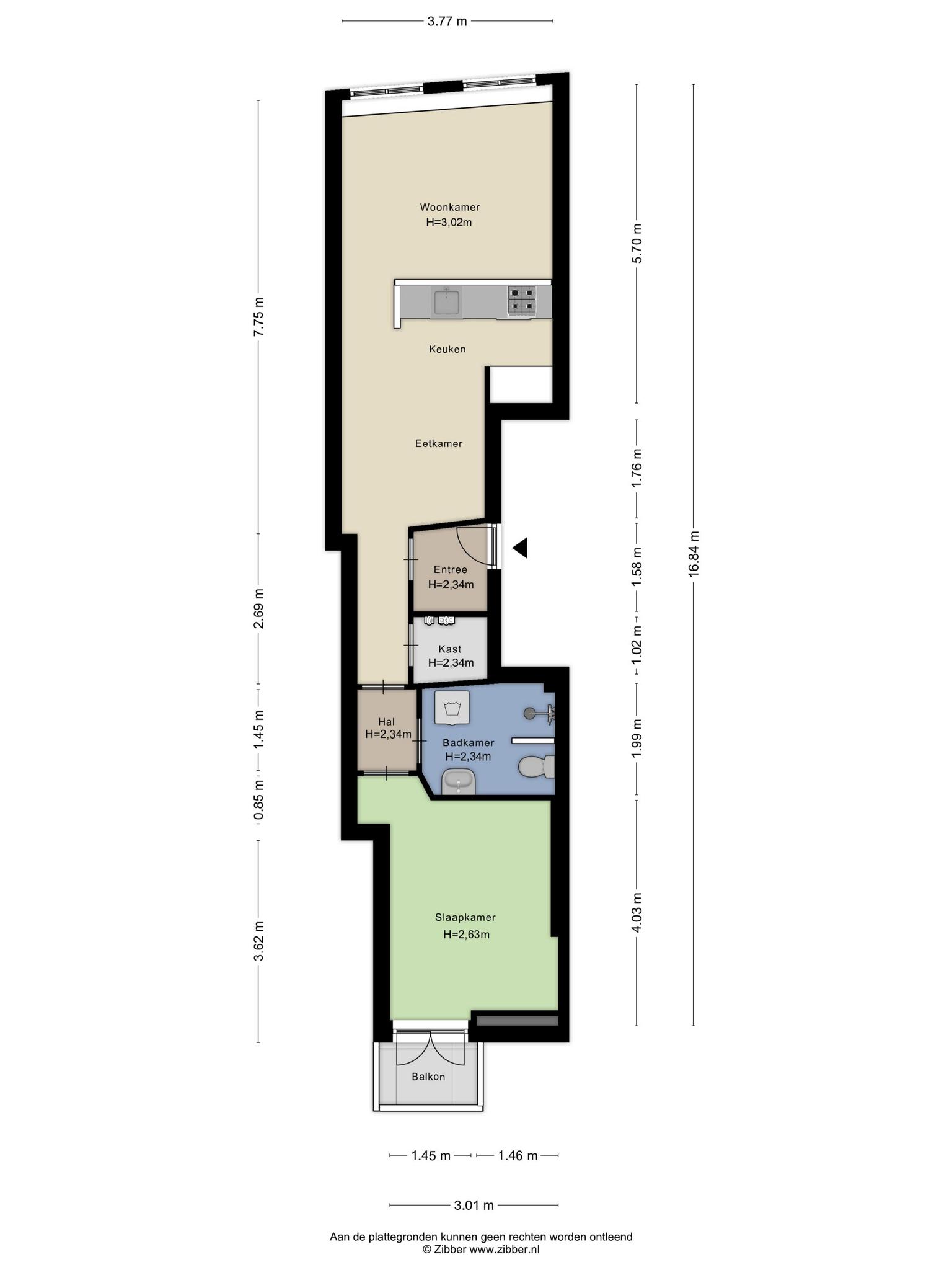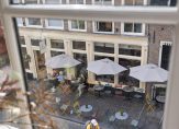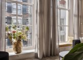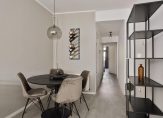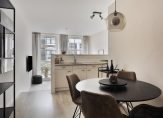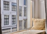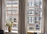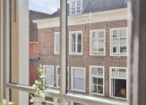 De eetkamer en keuken staan, met een klein niveauverschil, in open verbinding met de woonkamer. Hier zie je een meer dan 3 meter hoog plafond en twee prachtige, hoge ramen met brede vensterbanken. Eén van de vensterbanken wordt nu gebruik als fijne zitplek in de zon, met uitzicht naar de straat boordevol historie en gezelligheid.