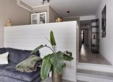 Open de voordeur naar de hal, die in verbinding staat met een gang. Links in de hal is ruimte voor een kapstok of, zoals nu, voor een ladekast en een grote spiegel.