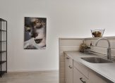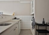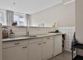 In de keuken staat een lichte wandopstelling met losse apparatuur, klaar voor een nieuwe invulling. De tweedeurs servieskast biedt veel bergruimten en het plateau wordt nu deels als koffiehoek gebruikt. Kies je voor een geheel nieuwe keuken of ga je stylen met andere apparatuur en mooie keukenaccessoires?