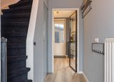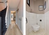 De ruime hal is, net als de rest van de woning, fraai verbouwd. De laminaatvloer met mooi houtpatroon ligt op bijna de hele begane grond en de muren zijn, net als het plafond, gestuct. Aan de linkerzijde, naast de trap, is de toiletruimte met wandcloset en de kast onder de trap biedt veel bergruimte.