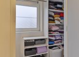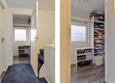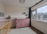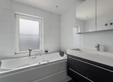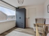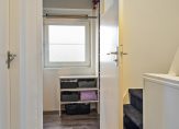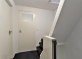 Niet alleen op de trap naar de eerste verdieping, maar ook op de overloop en de trap naar de tweede verdieping ligt zwart tapijt. Op de eerste verdieping zijn twee slaapkamers, een ruime badkamer en een superhandige kleedruimte.