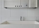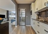 Een trendy zwarte deur met glas verbindt de hal met de keuken. Hier zie je dat de muur naar de woonkamer grotendeels is verwijderd, waardoor de ruimte optisch een stuk groter is geworden. In de keuken staat een lichte wandopstelling met donkere accenten, waaronder zwarte greepjes. Alle benodigde apparatuur is ingebouwd: een inductie kookplaat, afzuigkap, vaatwasser, koelkast en een combi-oven/magnetron.