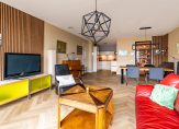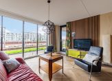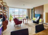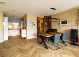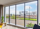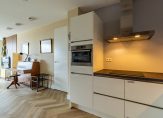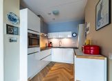 Een fraaie deur met glas verbindt de hal met de sfeervolle woonkamer, waar het uitzicht naar de binnenhaven centraal staat. Ramen van vloer tot plafond zorgen voor veel lichtinval, bij het zit- en bij het eetgedeelte. In de keuken staat een lichte, moderne hoekopstelling met een inductie kookplaat, afzuigkap, Quooker, vaatwasser, combi-oven, koelkast en een vriezer.