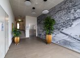 In de hal ligt, net als in bijna het hele appartement, een fraaie visgraatvloer met vloerverwarming. Naast de meterkast is de toiletruimte, ingedeeld met een wandcloset en een fonteintje.