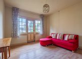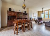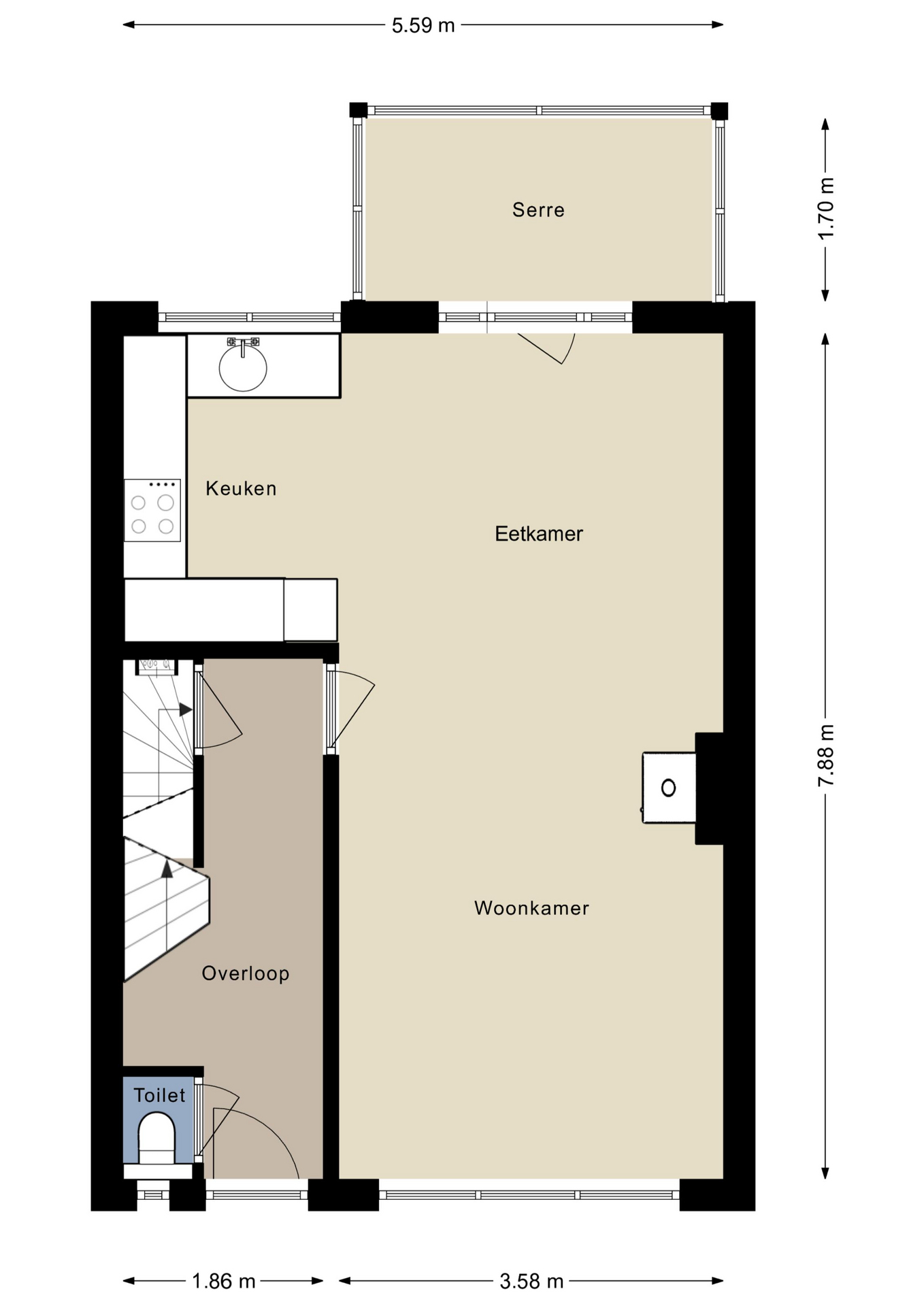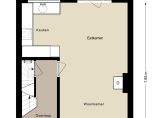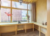 De bijna 8 meter lange woonkamer staat in open verbinding met de keuken. Aan de voorzijde, bij de schouw met gaskachel, is het zitgedeelte en bij het eetgedeelte is een schuifdeur naar de serre. Aan drie kanten staat een vaste tafel, die ook als brede vensterbank gebruikt kan worden. Wordt de serre een plek om lekker in de zon te zitten, een speelplek voor de kinderen of je thuiswerkplek?