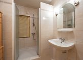 De badkamer, met een groot raam in de buitengevel, bevindt zich aan de achterzijde. Over de hele breedte is een douche gemaakt, en aan de rechterzijde hangt een wastafel met een spiegel en planchet. Ook de geiser, die voor warm water zorgt, hangt in de badkamer.