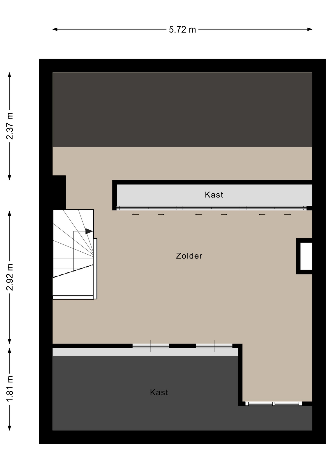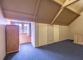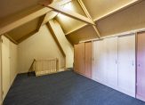Er is een vaste trap naar de tweede verdieping, waar een grote ruimte klaar is voor een nieuwe invulling. Twee ramen in de dakkapel zorgen voor lichtinval, en er is volop bergruimte in de kastenwand en de berging in de schuinte van het dak.