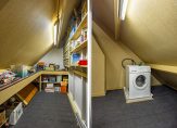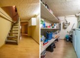 Achter een van de paneeldeuren is de trap naar het zeer ruime souterrain. Er zijn maar liefst vijf ruimtes, onder andere geschikt als berging en hobbyruimte. Een van de ruimtes grenst aan een buitentrap, richting de achtertuin.