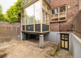 Als je de achtergevel goed bekijkt, zie je dat er vroeger een buitendeur naar de keuken was. Nu is de geheel bestrate achtertuin vanuit het souterrain te bereiken. De ligging is op het westen, perfect voor de zonliefhebber, en er is een poort naar de steeg. En als je als laatste de voortuin ziet, ben je op slag verliefd…