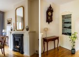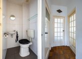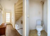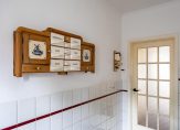 In de ruime, lichte hal ligt een bruine plavuizen vloer. Aan de linkerzijde zijn de sierlijke trapopgang, een trap naar de wijn-/provisiekelder en de toiletruimte. Ook de originele binnendeuren zijn behouden, wat zorgt voor een hal met sfeer.