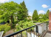 Ook het balkon, op de eerste verdieping, is op het westen gericht. De voortuin, met lage beplanting en een brede haag, geeft de woning een vriendelijke uitstraling.