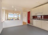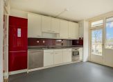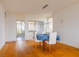 Aan de voorzijde van het gebouw is de dichte eetkeuken, met toegang tot het tweede balkon. De keuken is, net als de rest van het appartement, heel licht. De keuken in wandopstelling heeft veel bergruimte en de inductie kookplaat, afzuigkap, combi-oven, vaatwasser en koel-/vriescombinatie zijn ingebouwd. Je kijkt niet alleen naar de rustige Rietbergstraat, maar ook richting gemaal Helbergen en enkele vrijstaande villa’s.