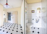 Vlak naast de lift is de voordeur van dit ruime, lichte hoekappartement. De hal met garderobe is een royale ontvangstruimte met een klassieke plavuizen vloer en bijpassende binnendeuren. Rechts in de hal is de toiletruimte met fonteintje, uitgevoerd in lichte kleuren.